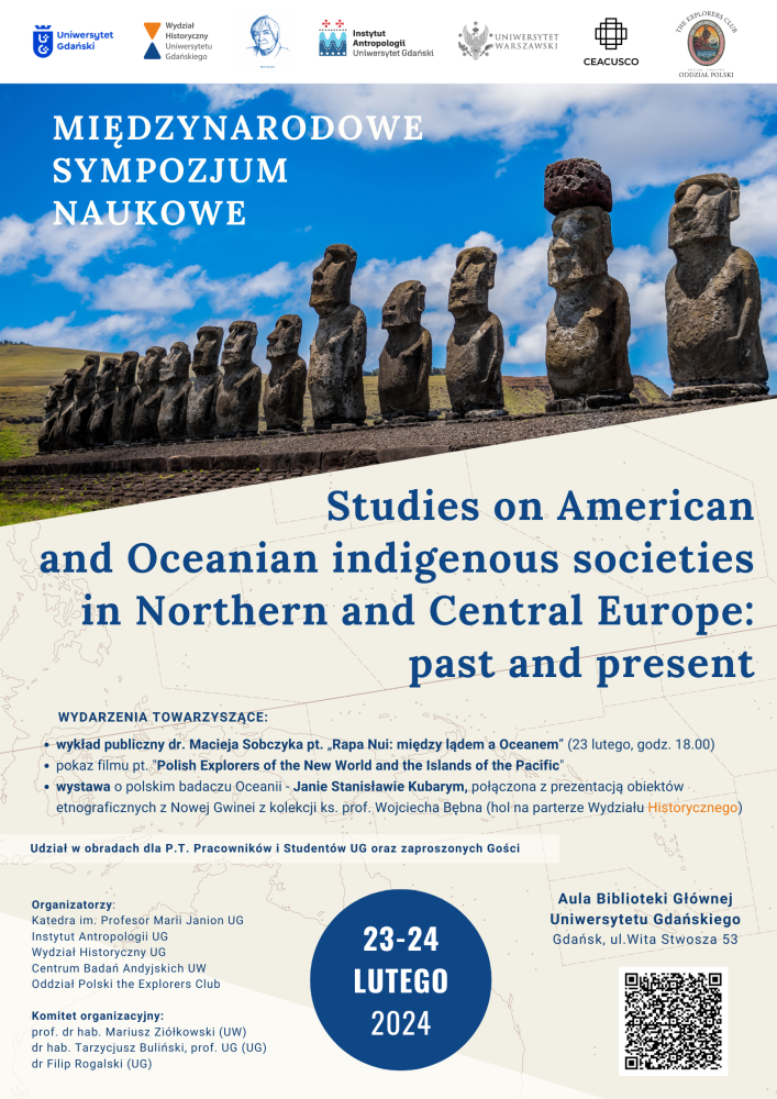 Katedra im Prof. Marii Janion Uniwersytetu Gdańskiego, Instytut Antropologii UG oraz Wydział Historyczny UG przy współpracy z Centrum Badań Andyjskich Uniwersytetu Warszawskiego oraz Oddziału Polskiego the Explorers Club zapraszają na międzynarodowe sympozjum naukowe pt. "Studies on American and Oceanian indigenous societies in Northern and Central Europe: past and present". Podczas sympozjum zaproszeni badacze i badaczki z Polski i z zagranicy przedstawią swoje badania z zakresu antropologii, archeologii i etnohistorii ludów tubylczych Ameryk i Oceanii.