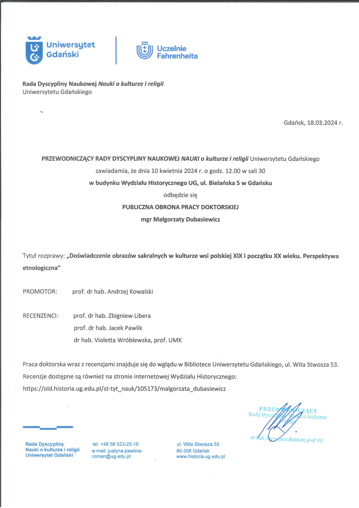 10 kwietnia 2024 r. o g. 12:00 w sali nr 30 (ul. Bielańska 5, Gdańsk) odbędzie się publiczna obrona pracy doktorskiej mgr Małgorzaty Dubasiewicz. Tytuł rozprawy: Doświadczenie obrazów sakralnych w kulturze wsi polskiej XIX i początku XX wieku. Perspektywa etnologiczna.